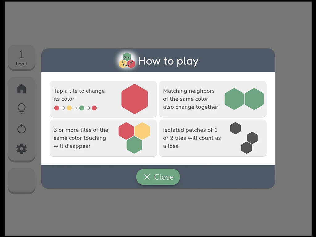 Each level gives you a grid of colored hex tiles. Tap a tile, and it shifts color along with nearby tiles of the same color. When three or more connect, they disappear.